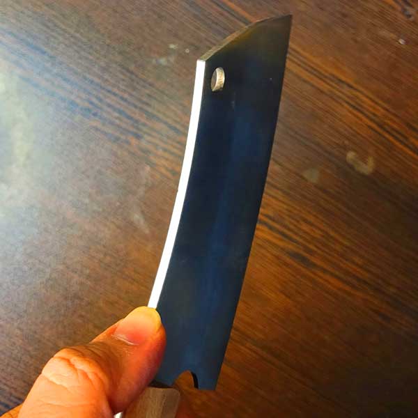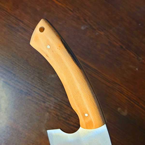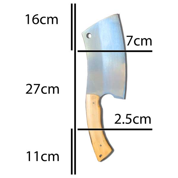 تیغهی ساطور از فولاد فنر ورق فولاد ساخته شده؛ فولادی مقاوم با سختی بالا که در برابر ضربه، فشار و لبپر شدن عملکردی عالی دارد.