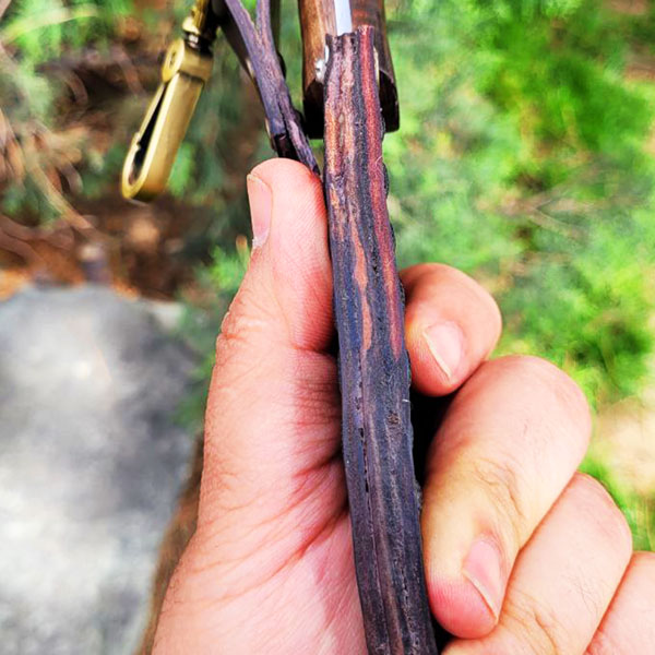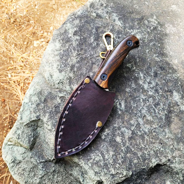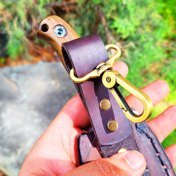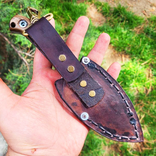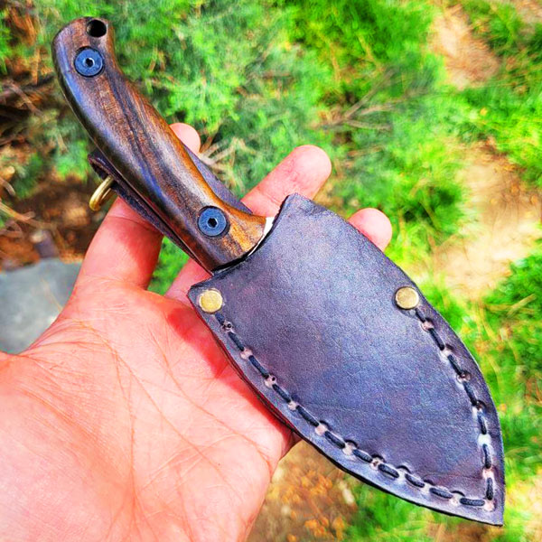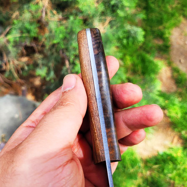 استفاده از ریشه چوب گردو در دسته، علاوهبر زیبایی، دوام بسیار بالایی ایجاد کرده است. غلاف چرمی گاومیش نیز ظاهری کلاسیک و محافظت کامل برای چاقو فراهم میکند.
