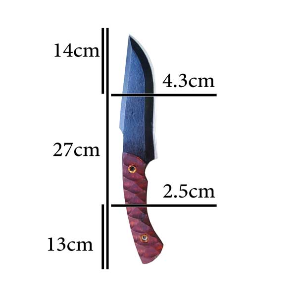 تیغه فولاد فنر با روکش بلک اکسید، دسته چوب سرخ، غلاف برزنتی مقاوم. سبک، خوشدست و حرفهای برای طبیعتگردی و کوهنوردی.